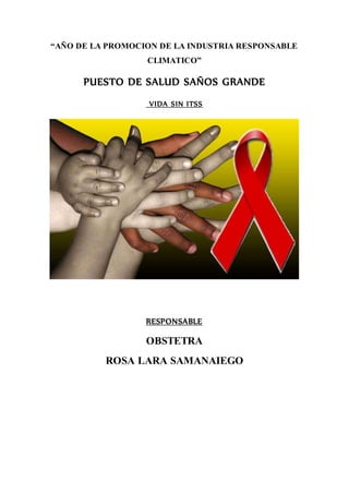 Este documento presenta un plan para prevenir infecciones de transmisión sexual en adolescentes en el puesto de salud de Saños Grande. El plan incluye realizar charlas educativas en colegios, visitas domiciliarias para brindar información a las familias, y coordinarse con otras instituciones para detectar y dar seguimiento a casos de ITS. El objetivo es disminuir las infecciones en adolescentes y sensibilizar a la población. Se llevará a cabo de enero a diciembre de 2014 en el anexo de Saños Grande.