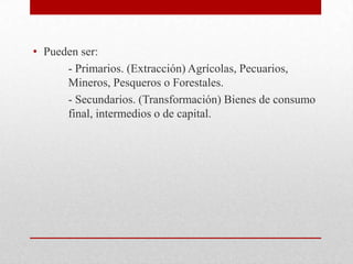 Los proyectos de producción de bienes pueden ser primarios como la agricultura, ganadería, minería, pesca o silvicultura que se dedican a la extracción, o secundarios como la transformación de bienes de consumo final, intermedios o de capital.