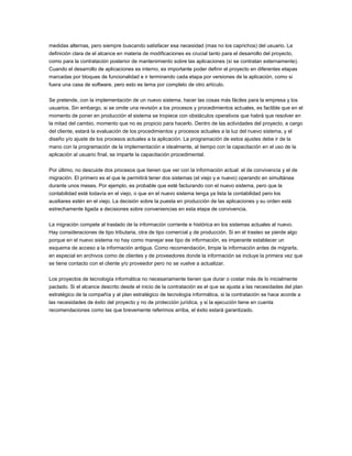 Los proyectos de tecnología informática a menudo duran más y cuestan más de lo presupuestado inicialmente debido a factores que no se consideran adecuadamente en la planificación, como la asignación de recursos humanos del cliente y la definición del alcance de modificaciones. Para que un proyecto tenga éxito, es crucial definir claramente el alcance del proyecto, revisar y ajustar los procesos actuales, y planificar adecuadamente la migración de datos e implementación en etapas.