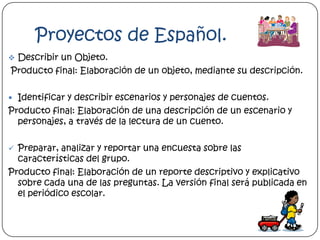 El documento describe los proyectos del 4° bimestre para las clases de Español y Ciencias. En Español, los estudiantes completarán proyectos para describir un objeto, un escenario o personaje de un cuento, y realizar una encuesta sobre el grupo. En Ciencias, analizarán las características de la luz, el sonido y los imanes, y construirán un dispositivo musical o magnético. Se enfatiza la importancia de esforzarse en los proyectos y entregarlos a tiempo.