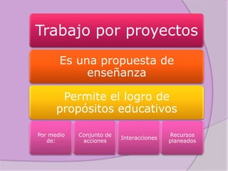 Este documento describe el trabajo por proyectos como una propuesta de enseñanza que permite lograr objetivos educativos a través de conjuntos de acciones e interacciones con recursos planeados. El trabajo por proyectos permite a los estudiantes acercarse gradualmente al mundo real de la lengua trabajando en situaciones cotidianas para que aprendan haciendo.