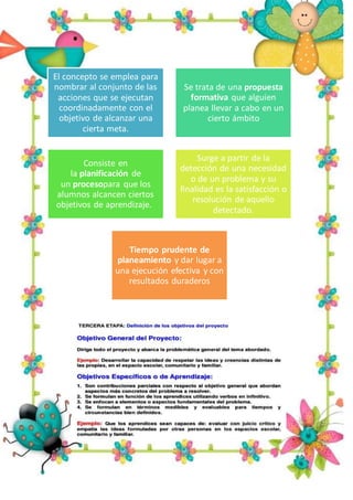 El documento define un plan como el conjunto de acciones coordinadas para alcanzar una meta. Un plan es una propuesta formativa planeada para lograr objetivos de aprendizaje en un ámbito específico. Consiste en planificar un proceso para que los estudiantes alcancen ciertas metas de aprendizaje y surge de identificar una necesidad o problema para resolverlo o satisfacerlo de manera efectiva y duradera.