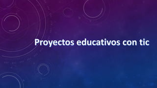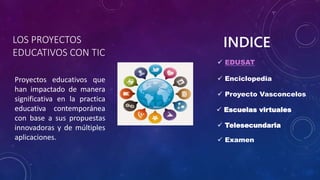 El documento describe varios proyectos educativos con TIC que han impactado la educación en México, incluyendo EDUSAT, Enciclopedia, Proyecto Vasconcelos, Escuelas Virtuales y Telesecundaria. EDUSAT es una red de televisión educativa vía satélite manejada por la SEP. La Enciclopedia es un proyecto en línea colaborativo. El Proyecto Vasconcelos lleva educación a zonas marginadas a través de autobuses equipados con tecnología. Las Escuelas Virtuales ofrecen programas