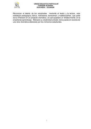 Este documento describe un proyecto escolar que busca promover la lectura y el teatro entre estudiantes. El proyecto utilizará técnicas teatrales como la dramatización de obras literarias para motivar a los estudiantes, mejorar sus habilidades expresivas y valorar el trabajo en equipo. El cronograma incluye actividades de investigación, prácticas teatrales y coevaluación a lo largo de varios meses para alcanzar los objetivos del proyecto.