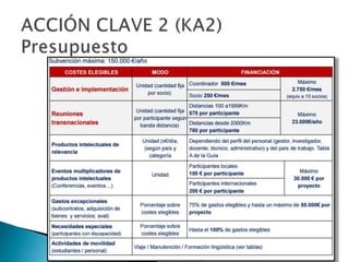 Erasmus+ es el programa de la Unión Europea para la educación, formación, juventud y deporte entre 2014 y 2020. Sus objetivos incluyen mejorar las competencias y la empleabilidad a través de la internacionalización, crear una Europa más productiva y socialmente cohesionada, y apoyar la estrategia Europa 2020 para mejorar la educación y formación.