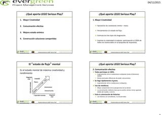 El documento presenta el uso de LEGO® Serious Play® (LSP) como una metodología para mejorar la gestión en organizaciones, facilitando la comunicación, la creatividad y la resolución de conflictos. Se describe su evolución desde los años 90 hasta su adopción en diversas empresas, así como sus beneficios en la construcción de soluciones compartidas y el fomento del compromiso del equipo. También se detallan procesos y dinámicas específicas para implementar LSP en proyectos, incluyendo la identificación de interesados y la gestión de riesgos.