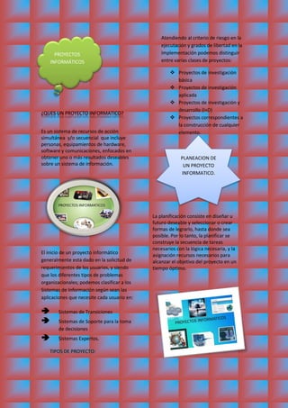 Este documento describe diferentes tipos de proyectos informáticos, incluyendo proyectos de investigación básica y aplicada, proyectos de investigación y desarrollo, y proyectos de construcción. También describe la planificación de un proyecto informático, la cual consiste en diseñar un futuro deseable y seleccionar formas de lograrlo mediante la secuencia de tareas necesarias y la asignación de recursos para alcanzar el objetivo del proyecto de manera óptima. Además, menciona que los virus informáticos son