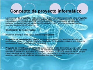 El documento habla sobre el desarrollo de proyectos informáticos. Se enfoca en cómo las empresas pueden crear y gestionar proyectos de software de manera efectiva. El objetivo principal es entregar soluciones digitales a tiempo y dentro del presupuesto planeado.