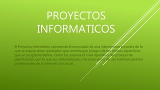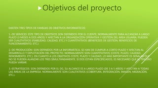 Este documento describe los diferentes tipos de proyectos informáticos, incluyendo objetivos, agentes involucrados y funciones. Existen tres tipos de objetivos: de servicio, de producción y estratégicos. Los proyectos varían en riesgo e implementación desde investigación básica hasta construcción. Un proyecto exitoso requiere planificación, coordinación y control por parte del jefe de proyecto y su equipo, el cual incluye analistas y programadores.