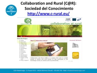 El documento describe varios proyectos e iniciativas de innovación social y territorial en España, incluyendo proyectos que permiten la participación de personas en zonas rurales y remotas en la sociedad del conocimiento, living labs mediterráneos que promueven la innovación en pequeñas empresas y desarrollo rural, y redes comunitarias que generan proyectos innovadores en áreas como turismo, empleo y medio ambiente. También menciona centros de asesoramiento, plataformas de formación y proyectos de financiamiento para apoyar la innov