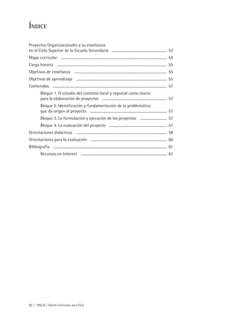 Este documento presenta la materia Proyectos Organizacionales del 6to año de la Escuela Secundaria Orientada en Economía y Administración. Se divide en 4 bloques: 1) Estudio del contexto local para proyectos, 2) Identificación de problemáticas para proyectos, 3) Formulación y ejecución de proyectos, y 4) Evaluación de proyectos. Proporciona objetivos de enseñanza y aprendizaje, contenidos, y orientaciones didácticas para que los estudiantes desarrollen e implementen proyectos organizacionales integr