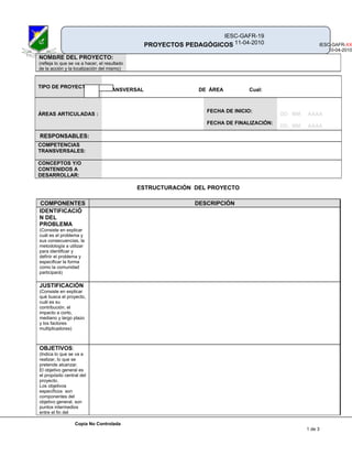 Este documento presenta un proyecto pedagógico que incluye su nombre, tipo, áreas articuladas, fechas de inicio y finalización, responsables, competencias, contenidos, identificación del problema, justificación, objetivos, metas, cronograma de actividades, población beneficiada, evaluación y seguimiento, costo total y fuente de financiamiento.