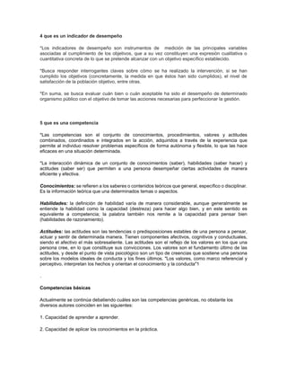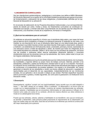 Los lineamientos curriculares son orientaciones definidas por el Ministerio de Educación Nacional para apoyar el proceso de planeación de áreas académicas. Los estándares especifican los conocimientos y habilidades mínimos que los estudiantes deben adquirir, y sirven como metas y medidas para la enseñanza. El desempeño se refiere a cómo se cumplen las responsabilidades a través de actitudes, valores, conocimientos y habilidades. Existen diferentes tipos de competencias como las profesionales, específicas, transvers