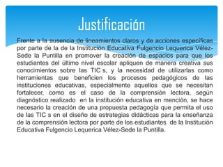 El documento propone el uso de las TIC en la enseñanza de la comprensión lectora para estudiantes de sexto grado en la institución educativa Fulgencio Lequerica Vélez-sede La Puntilla. Se identifican la falta de lineamientos claros y la necesidad de implementar estrategias didácticas que integren recursos tecnológicos para mejorar el aprendizaje. Se plantea la creación de un proyecto pedagógico que fomente espacios para la aplicación creativa de conocimientos sobre TIC y su impacto en la comprensión lectora.