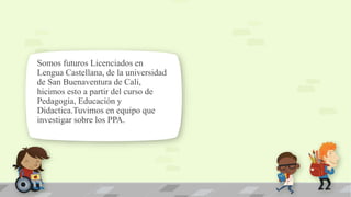 Este documento describe los Proyectos Pedagógicos de Aula (PPA), que son estrategias de planificación de la enseñanza diseñadas por los docentes teniendo en cuenta las necesidades de los estudiantes y la escuela. Los PPA integran los diferentes componentes del currículo de una manera global para mejorar la calidad de la educación. Es importante que los docentes conozcan sobre los PPA porque permiten lograr el éxito escolar, construir conocimiento de forma colectiva, y transformar la práctica pedagógica.