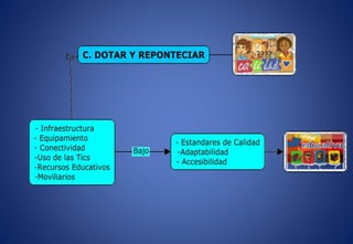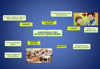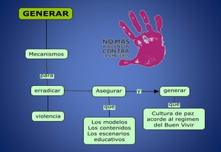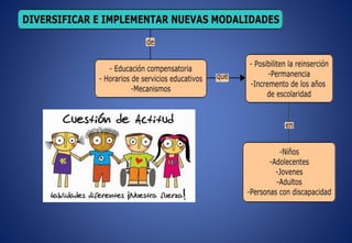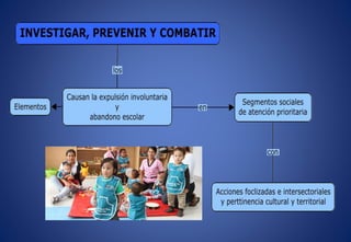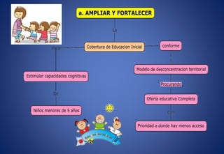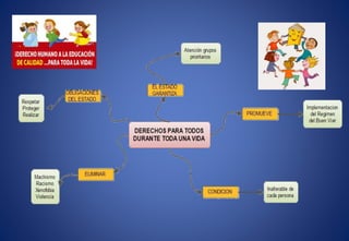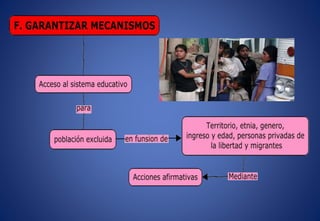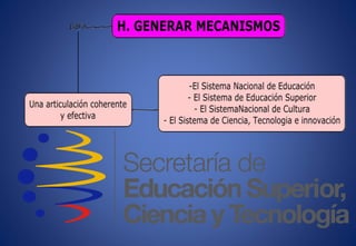Este documento presenta un resumen de las políticas y lineamientos estratégicos del Plan Nacional de Desarrollo 2017-2021 de Ecuador en relación a la educación. Se destacan cinco objetivos principales: 1) alcanzar la universalización del acceso a la educación inicial, básica y bachillerato y democratizar el acceso a la educación superior, 2) promover la culminación de los estudios en todos los niveles educativos, 3) mejorar la calidad de la educación en todos sus niveles bajo principios de igualdad, equidad e inclus