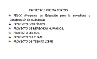 El documento presenta la descripción de varios proyectos obligatorios de la Institución Educativa San José para el año 2011, incluyendo el PESCC, proyecto ecológico, proyecto de derechos humanos, proyecto lector, proyecto cultural y proyecto de tiempo libre. Se detalla la mesa de trabajo formada por el rector, coordinadores y docentes encargados de cada proyecto. Luego, se describen en detalle cada uno de los proyectos y sus componentes de gestión institucional, producción pedagógica,