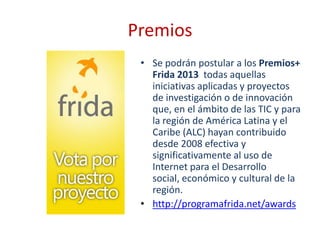 El documento describe varias iniciativas y proyectos que usan tecnologías de la información y la comunicación (TIC) para el desarrollo social y económico en América Latina y el Caribe. Incluye información sobre premios, financiamientos e investigaciones que demuestran cómo las TIC mejoran el rendimiento escolar. También resume un informe del Banco Mundial sobre cómo las TIC contribuyen a la reducción de la corrupción, el empleo y la participación ciudadana.