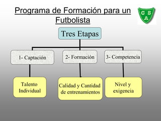 Este documento describe un programa de formación para futbolistas que incluye tres etapas (captación, formación y competencia) y se enfoca en el desarrollo de las capacidades físicas, técnicas y tácticas de los jugadores a través de cinco etapas (formación de base, iniciación deportiva, especialización deportiva, perfeccionamiento deportivo y alto rendimiento). El programa detalla la planificación y progresión del entrenamiento en áreas funcionales clave como la velocidad, fuerza, resistencia, entre otras.