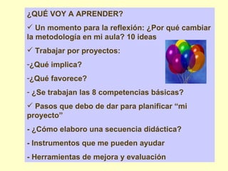 El documento describe los pasos para planificar un proyecto de trabajo en el aula. Explica que primero se debe definir el tema o asunto, los objetivos, las tareas y actividades requeridas, los recursos necesarios y un calendario. También describe cómo el profesor guía el proceso de desarrollo del proyecto mediante la especificación de objetivos, la búsqueda de información, el tratamiento de datos y la evaluación del aprendizaje de los estudiantes.