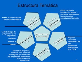El documento presenta una guía sobre la metodología de proyectos educativos. Explica que los proyectos educativos permiten planificar, enseñar y evaluar de manera innovadora y centrada en el aprendizaje de los estudiantes. Describe las diferentes etapas del proceso de proyectos, incluyendo la definición, planificación, ejecución y evaluación. También destaca la importancia de que los estudiantes participen activamente en cada etapa del proceso de proyectos educativos.