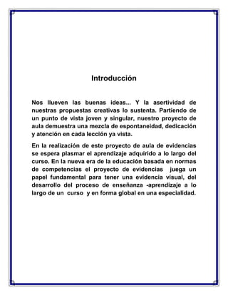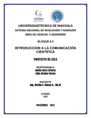 Este documento presenta información sobre un proyecto de aula para el curso de Introducción a la Comunicación Científica. Contiene 5 lecciones que cubren temas como el significado de palabras, antónimos, sinónimos y la clasificación y ordenamiento de palabras. El objetivo general del proyecto es permitir que los estudiantes demuestren sus logros y progresos en el curso a través de la realización de actividades y ejercicios.