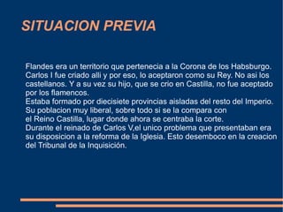 La Guerra de Flandes se desató en 1568 entre España y los Países Bajos y duró hasta 1648. Comenzó debido al descontento de los flamencos con el rey Felipe II y su política religiosa y económica. La guerra se libró no solo en Flandes sino en otras colonias y rutas comerciales durante 80 años, con periodos de paz. Finalmente, Holanda logró su independencia de España, mientras que España perdió una posesión y se arruinó económicamente.