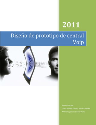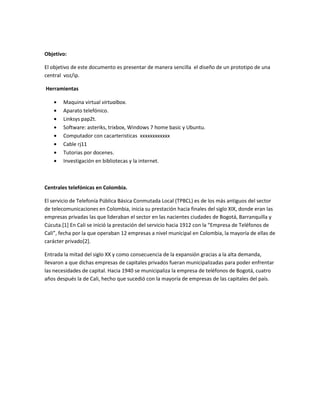 Este documento presenta el diseño de un prototipo de central de voz sobre IP. El objetivo es explicar de manera sencilla cómo funciona una central VoIP utilizando herramientas como VirtualBox, Asterisk, un linksys PAP2T y teléfonos. El documento también describe brevemente la historia de las centrales telefónicas en Colombia y las características técnicas del software Asterisk que se utilizará para la central VoIP.