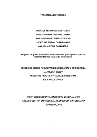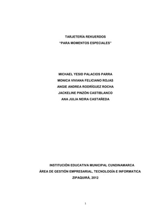 Este documento presenta el plan de negocios de la empresa Tarjetería Rekuerdos, la cual se dedica a la producción y distribución de tarjetas de diversas ocasiones. En primer lugar, se describen las diferentes ideas de negocio propuestas por los socios y cómo se seleccionó la idea de las tarjetas. Luego, se explica el proceso de producción de tarjetas, incluyendo el diseño, impresión y acabado. Finalmente, se presentan las estrategias de mercadeo, operaciones, finanzas y proyecciones de ventas