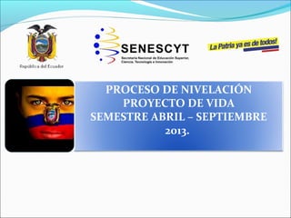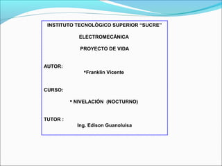 Este documento presenta el proyecto de vida de Franklin Vicente, un estudiante del Instituto Tecnológico Superior "Sucre" en el curso de Nivelación Nocturno. El proyecto de vida incluye una introducción sobre la importancia de definir un proyecto de vida, así como objetivos, una descripción de sus fortalezas, debilidades, oportunidades y amenazas, y sus metas de convertirse en una persona exitosa y útil para la sociedad.