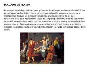 El primer diálogo habla sobre la polis griega y cómo las aldeas se sometieron a ella. El segundo diálogo discute las oligarquías y democracias existentes y su eficacia. También analiza Esparta. El tercer diálogo presenta las teorías políticas de Platón y critica las teorías políticas corrientes que veían al Estado como parte de la naturaleza y por lo tanto irreformable.