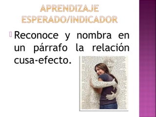 El documento presenta información sobre la educación para la convivencia, la paz y la ciudadanía. Explica que un párrafo debe informar de manera completa sobre un tema y puede presentar una relación de causa y efecto. Proporciona un ejemplo de un párrafo de causa y efecto sobre la situación de Irlanda en el siglo XIX que llevó a una fuerte emigración hacia Estados Unidos. Finalmente, ofrece instrucciones para construir un párrafo de causa y efecto utilizando la obra literaria "Chubasco