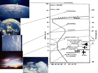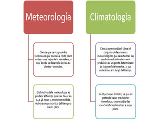 El documento proporciona definiciones de climatología, clima y tiempo. Explica los elementos del clima como la insolación, temperatura, presión atmosférica y viento. Describe cómo se miden y distribuyen las temperaturas a nivel global y los factores que las influyen. También cubre temas como la humedad, precipitaciones, formación de nubes y tipos de precipitación.