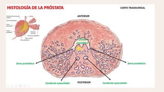 La próstata es una glándula sexual accesoria del hombre que mide aproximadamente 2x3x4 cm y pesa unos 20 gramos. Se compone de 40 glándulas tubulares que secretan líquido prostático rico en ácido cítrico, fosfatasa ácida y antígeno prostático específico. Histológicamente, la próstata se divide en tres zonas - periuretral, central y periférica - que contienen glándulas de diferente tamaño cuyos conductos desembocan en la uretra.