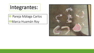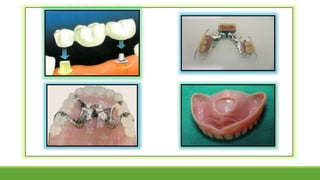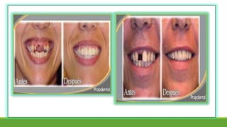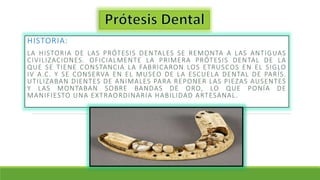 El documento resume la historia de las prótesis dentales desde las antiguas civilizaciones hasta la actualidad. Las primeras prótesis datan del siglo IV a.C. y eran fabricadas por los etruscos usando dientes de animales montados en bandas de oro. A lo largo de los siglos, se han ido mejorando los materiales y técnicas de fabricación, incluyendo hueso, marfil, oro y resina acrílica. Hoy en día existen diferentes tipos de prótesis que pueden ser soportadas por dientes, mucosas, d