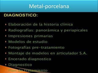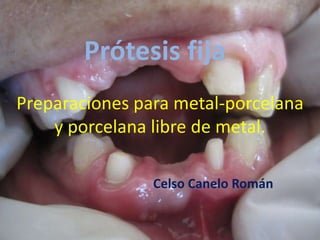 Este documento describe los procedimientos para preparaciones dentales para prótesis fijas de metal-porcelana y porcelana libre de metal. Explica que la máxima retención se logra cuando solo hay una dirección de entrada y salida de la restauración. También cubre factores como la estabilidad, integridad marginal, y ventajas y contraindicaciones de las prótesis de porcelana libre de metal.