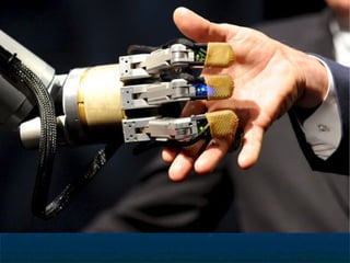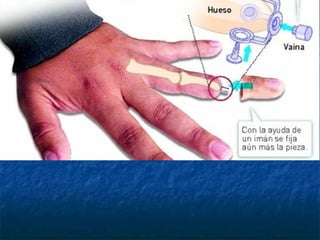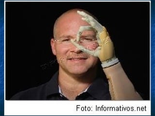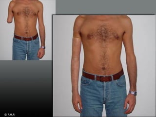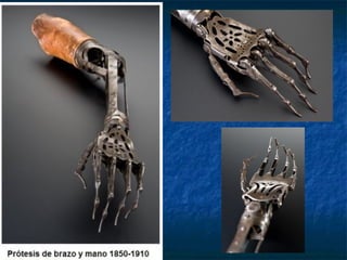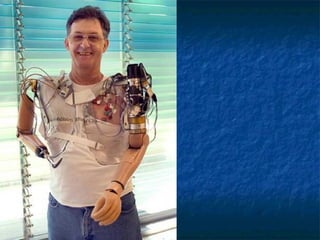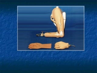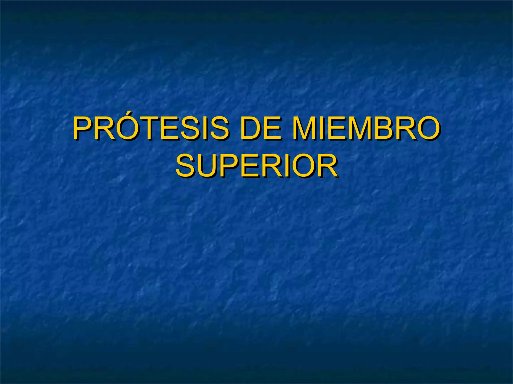 Este documento describe los diferentes tipos y niveles de amputación de miembros superiores y las principales características de las prótesis disponibles. Se detallan los componentes clave como manos, muñecas, codos y hombros, así como los sistemas de fijación, movilidad y control. También se discuten las prótesis estéticas, mioeléctricas y de tracción por cable, y se ofrece una visión del futuro de las prótesis sensibles y controladas por señales cerebrales.