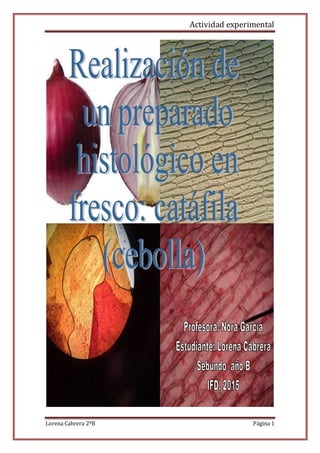 Este documento describe una actividad experimental para preparar muestras microscópicas frescas y teñidas de catáfila de cebolla y observarlas bajo el microscopio. Se presenta el marco teórico sobre preparados histológicos, el procedimiento experimental que incluye la preparación de dos muestras (una fresca y otra teñida con Lugol), y las observaciones realizadas de cada muestra. Se concluye que el colorante permitió observar con mayor claridad los componentes de la catáfila y que es una actividad a