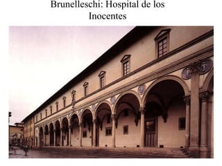 Este documento lista importantes obras de arte del Renacimiento italiano creadas entre los siglos XIV y XVI, incluyendo pinturas, esculturas y edificios diseñados por artistas como Giotto, Brunelleschi, Donatello, Masaccio, Botticelli, Miguel Ángel, Rafael, Leonardo da Vinci y Tiziano.