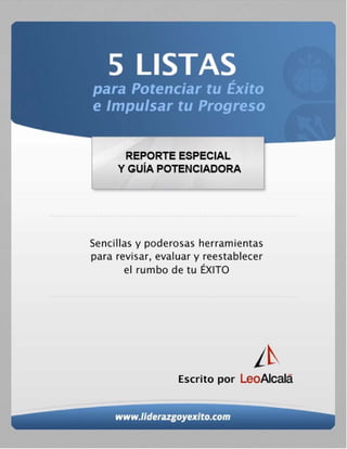 Este documento proporciona 5 listas para potenciar el éxito y el progreso personal. Sugiere revisar periódicamente los logros alcanzados, cómo se ha contribuido a ellos, las decisiones tomadas y sus consecuencias, y aprendizajes obtenidos para definir acciones concretas a implementar que permitan avanzar de forma deliberada. El objetivo es evitar la repetición automática de patrones e impulsar la evolución personal y profesional aprovechando cada nuevo período de tiempo.