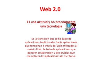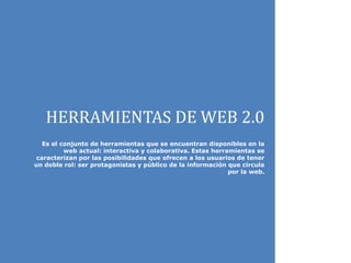 La Web 2.0 se caracteriza por herramientas interactivas y colaborativas que permiten a los usuarios participar como creadores y consumidores de contenido. Estas comunidades de conocimiento comparten información de manera abierta y se basan en la contribución de los propios usuarios para asegurar la calidad de los contenidos. Los blogs y wikis son los principales exponentes de esta web social, donde los usuarios no solo comparten sino que también opinan, editan y modifican la información de manera colectiva.