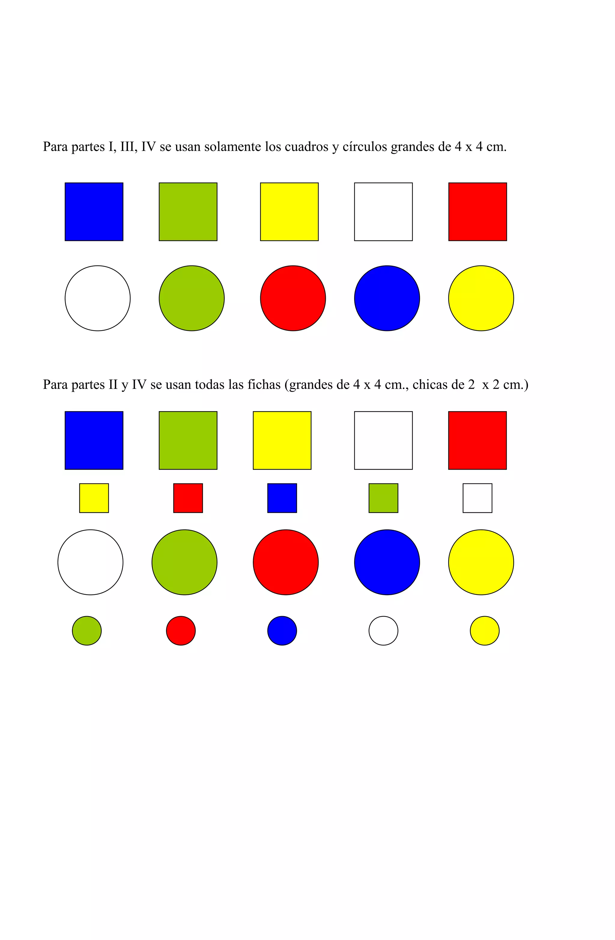 El documento indica que la prueba consta de 5 partes. Las partes I, III y V solo utilizan cuadrados y círculos grandes de 4x4 cm. Las partes II y IV utilizan cuadrados y círculos grandes y pequeños. El objetivo es tocar los objetos indicados siguiendo las instrucciones.