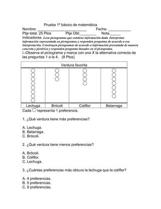 Este documento presenta un examen de matemáticas de primer año básico que incluye preguntas sobre la interpretación y construcción de pictogramas. En la primera sección, los estudiantes deben observar un pictograma sobre verduras favoritas y responder preguntas sobre las preferencias. En la segunda sección, se pide construir una tabla de conteo a partir de datos sobre meses de cumpleaños. En la tercera sección, se pide construir un pictograma sobre sabores de leche preferidos basado en una tabla de conteo dada. En las últimas se