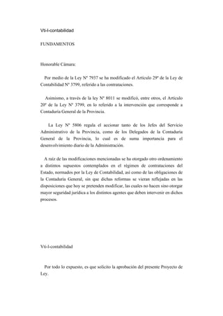 Este documento propone modificaciones a las leyes existentes sobre contabilidad y contrataciones del estado en la provincia de Mendoza. Explica que las leyes 7937, 8011 y 5806 introdujeron cambios en estas áreas, pero que las disposiciones actuales no reflejan esas modificaciones. Por lo tanto, se solicita la aprobación de un proyecto de ley que modificaría el artículo 8 de la ley 5806 para dar mayor claridad sobre los procedimientos de contratación y la intervención de la Contaduría General.