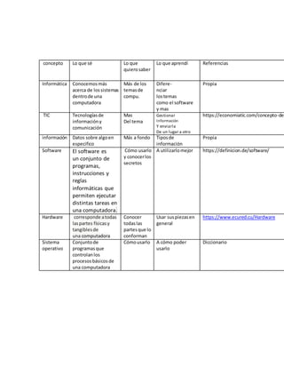 El documento presenta una tabla con conceptos relacionados con la informática y las tecnologías de la información. En la tabla, cada concepto incluye una breve definición, temas que el autor quiere saber más y lo que aprendió sobre cada tema con referencias adicionales.