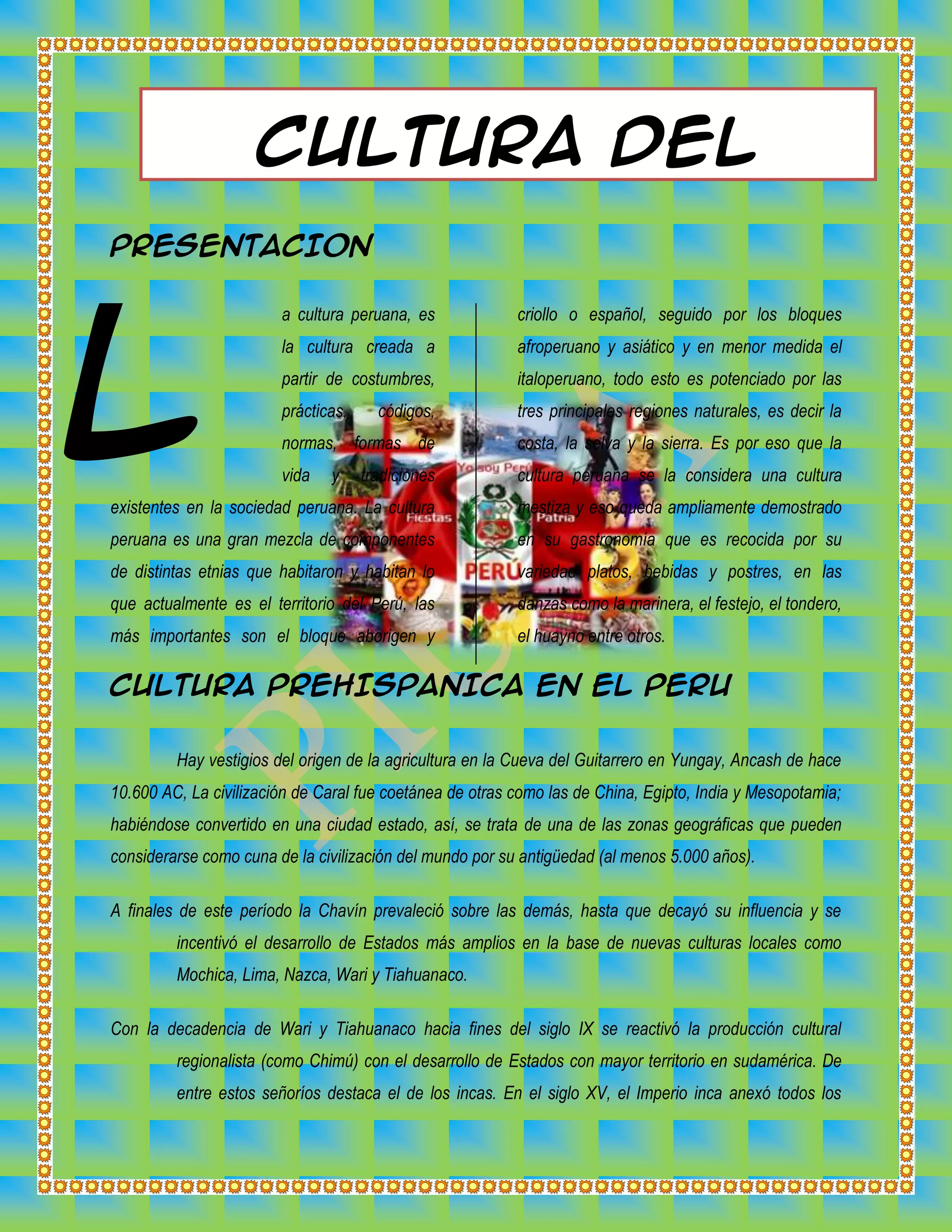 La cultura peruana es una mezcla de diversas etnias que habitaron el territorio peruano, incluyendo los bloques aborigen, criollo, afroperuano y asiático. La cultura prehispánica incluye varias civilizaciones importantes como Chavín, Paracas, Moche, Nazca, Tiahuanaco, Chimú y Huari. Tras la conquista española en el siglo XVI, se estableció el Virreinato del Perú y la religión católica se convirtió en la dominante, aunque