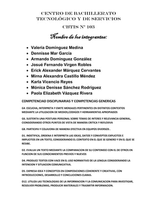 Este documento presenta una lista de 9 estudiantes que son miembros de un centro de bachillerato tecnológico, junto con una lista de 8 competencias disciplinarias y genéricas que incluyen habilidades como escuchar, interpretar y emitir mensajes; sustentar una postura personal sobre temas de interés; participar en equipos diversos; identificar e interpretar ideas en textos; evaluar textos; producir textos con un uso normativo del lenguaje; expresar ideas de manera coherente y creativa; y utilizar tecnologías de la inform