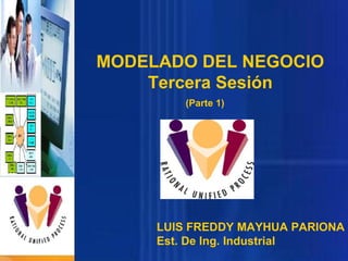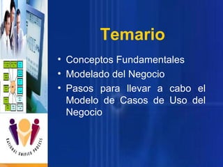 Este documento presenta los conceptos y pasos fundamentales para modelar el negocio. Explica conceptos como proceso, área funcional y proceso de negocio. Luego, detalla los objetivos del modelado del negocio, como comprender la estructura y dinámica del negocio y asegurar que los usuarios se integren. Finalmente, describe los cuatro pasos clave para modelar los casos de uso del negocio: 1) identificar la situación actual, 2) identificar los casos de uso, 3) identificar los actores, y 4) realizar el diagra