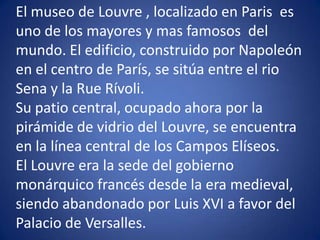 El Museo del Louvre en París es uno de los museos más grandes y famosos del mundo, ubicado en el antiguo palacio real donde la familia real francesa solía vivir. Alberga obras maestras mundialmente conocidas como la Mona Lisa de Leonardo da Vinci, la Victoria de Samotracia y la Venus de Milo, así como grandes colecciones de arte egipcio, europeo y otras culturas.