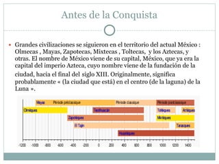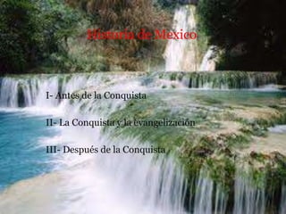 Este documento resume la historia de México desde las antiguas civilizaciones precolombinas como los olmecas, mayas y aztecas, hasta la conquista española en el siglo XVI y los eventos posteriores como la evangelización, la independencia de México y las guerras con Estados Unidos y Francia. También describe debates sobre cómo evangelizar a los pueblos indígenas y la Revolución Mexicana de 1910.